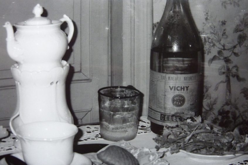Auf der Kommode aus Rosenholz gab es eine naturalistische Veranschaulichung der berühmtesten Passage aus Prousts Roman. Neben einer verstauben Flasche Vichy-Wasser, das die Verdauung der armen Léonie fördern sollte, stand eine Teetasse auf einem Tablett, daneben lag eines jener ovalen Sandgebäcke, die man „Petite Madelaine“ nennt, und auf einem Teller ein Häufchen Lindenblütenblätter.