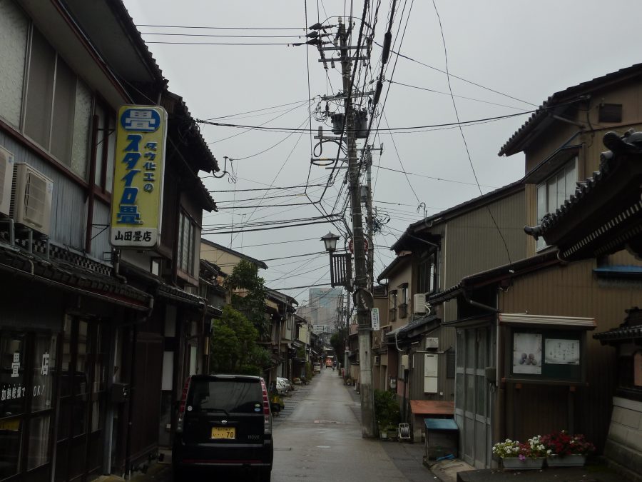 Kanazawa liegt im Westen von Japan, ungefähr auf der Höhe von Tokio und drei Bahnstunden nördlich von Kyoto. Wir fuhren durch weite Reisfelder und bewaldete Berge, der Meeresküste entlang, durch kleine Städte und Dörfer. Die Bauernhäuser hatten blaue Dächer.